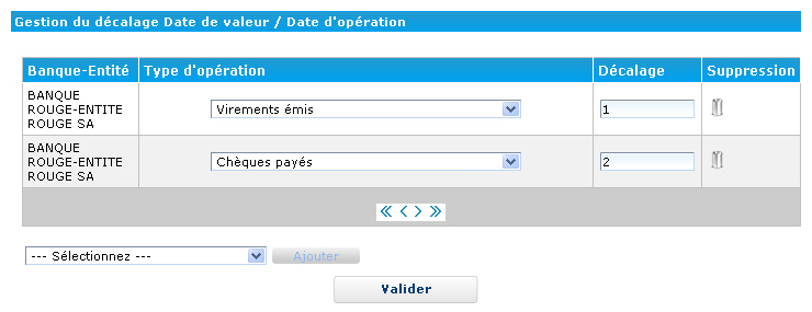 Lors de la saisie de nouvelles écritures, ou bien lors de la création d'écritures par récurrence, le calcul de la date de valeur s'appuie sur ce référentiel pour connaître le décalage entre la date d'opération et la date de valeur.