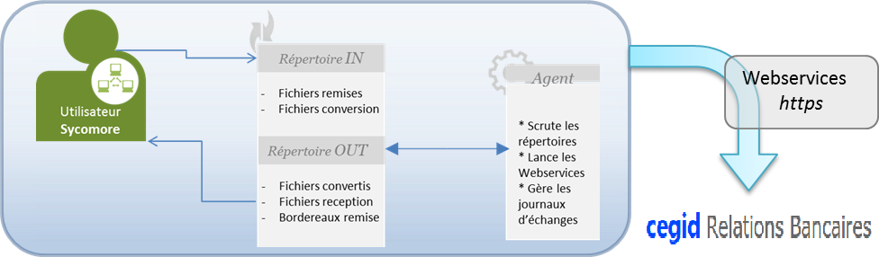 Pour chaque type d’opérations, il est défini des répertoires d’entrée et de sortie. L’agent scrute les répertoires d’entrée en attente de fichiers à traiter. Dès qu’un fichier est détecté, il est transmis à Cegid Relations Bancaires pour traitement.