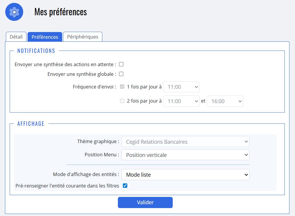 - La configuration de l’interface graphique va permettre à l’utilisateur de choisir le thème graphique dans lequel il va travailler. Cegid Relations Bancaires dispose de plusieurs modes graphiques et de plusieurs autres options d’affichage. On pourra notamment gérer les entités sous un mode liste ou mode étiquette. On pourra également pré-renseigner l’entité courante dans tous les filtres de sélection.