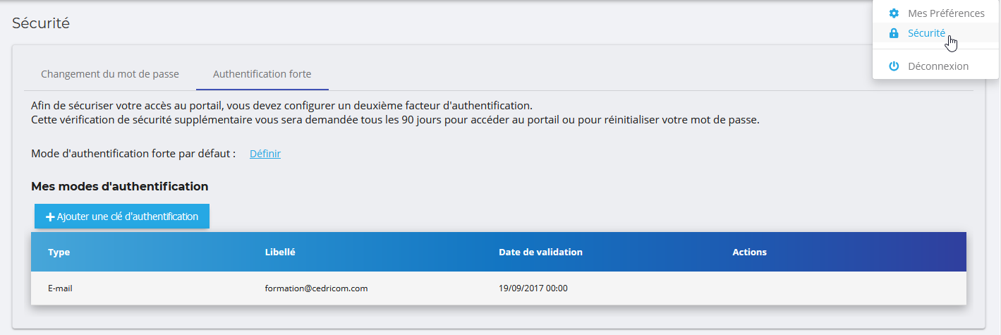 Pour activer ou modifier l’authentification forte pour un utilisateur, il faut accéder à l’écran de gestion de la sécurité, menu utilisateur en haut à droite.